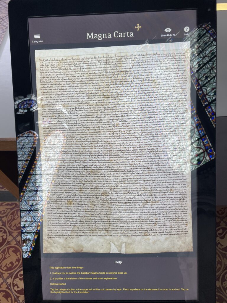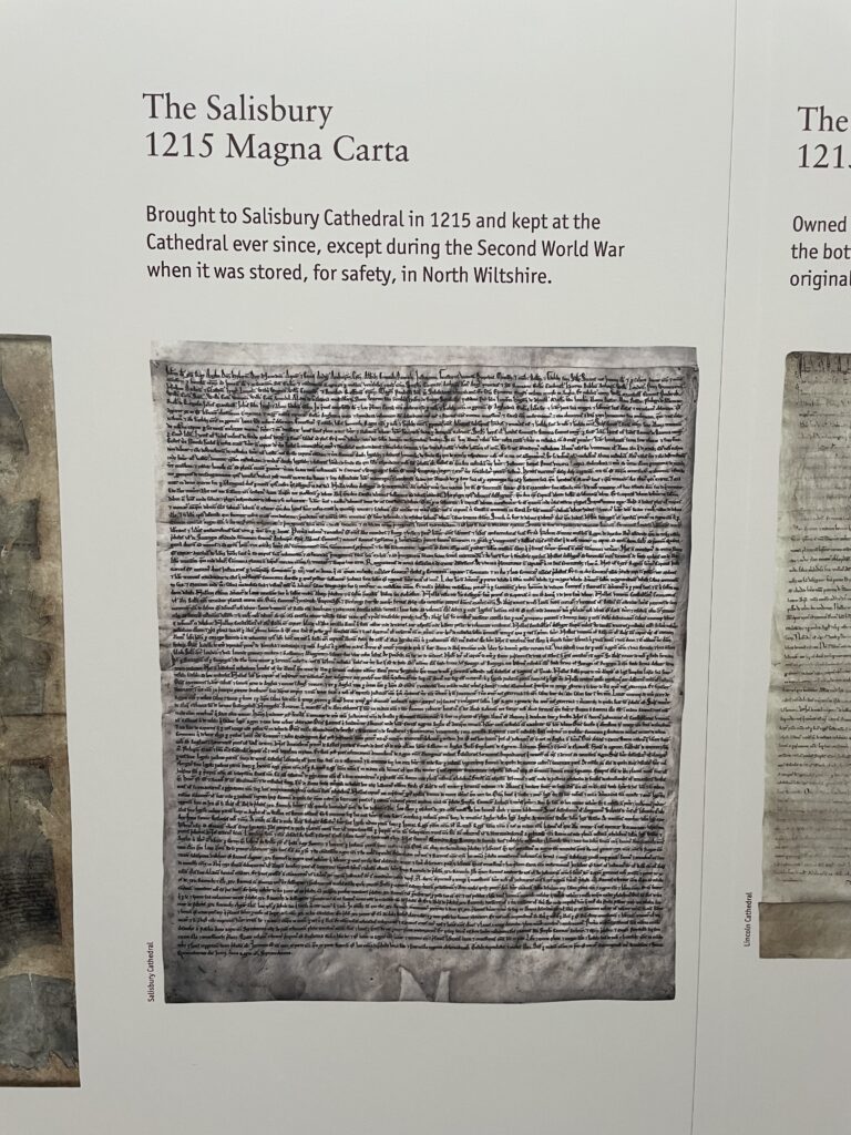 In addition to the Church bit, the Cathedral was also home to one of the copies of the Magna Carta. The Magna Carta is a 1215 English charter that guaranteed rights to “free men” and is considered a foundational document for individual liberties and the rule of law. There are only four surviving copies of the 1215 Magna Carta, with two held by the British Library, one at Lincoln Cathedral, and one at Salisbury Cathedral.