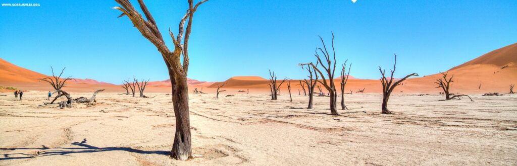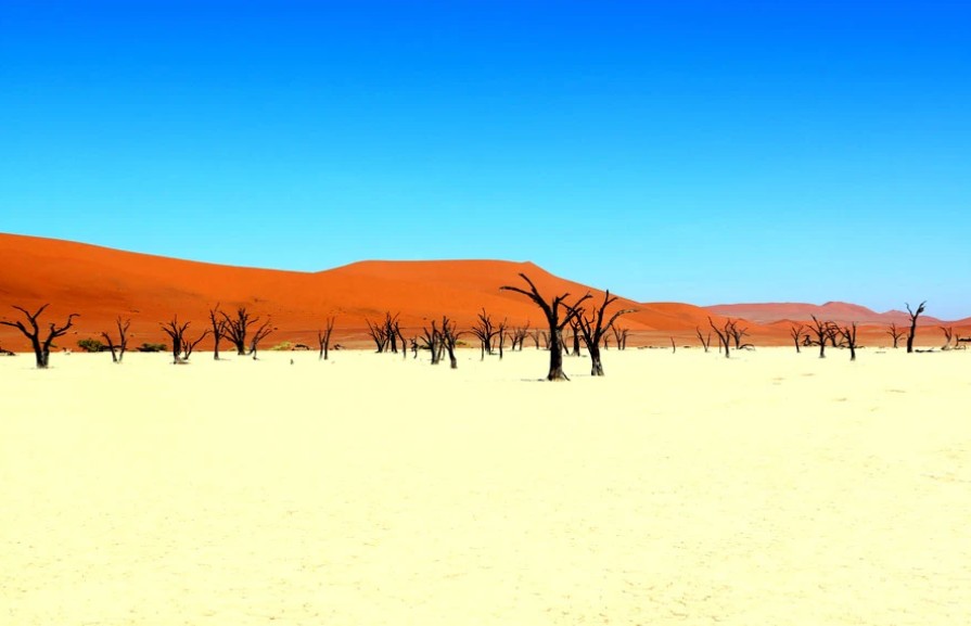 Deadvlei is an area in the park that is mostly made up of a major clay/salt pan and dead trees. The pan was formed when the Tsauchab River flooded and the abundance of water allowed camel thorn trees to grow. However, the climate changed and the sand dunes encroached on the pan, blocking the river from reaching the area. The trees are estimated to be approximately 900 years old, however they have not decomposed due to the dry climate.